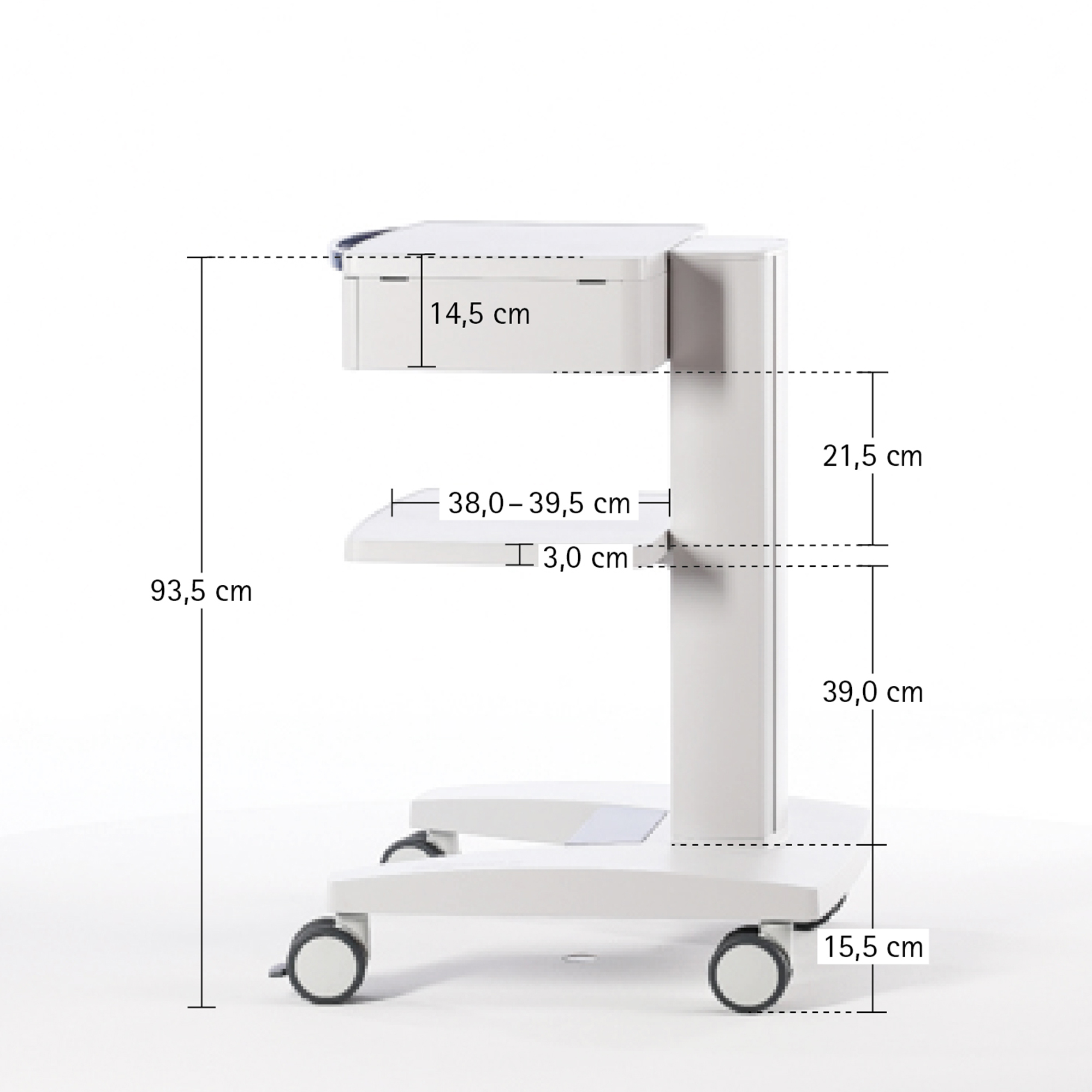 All shelves are elaborately manufactured of cast aluminum with a powder coating and can support loads of up to 20 kg (surface load). The shelf width is designed to easily accommodate a standard keyboard. Convenient grip handles for easy moving of the equipment cart are available in various designs and colors.